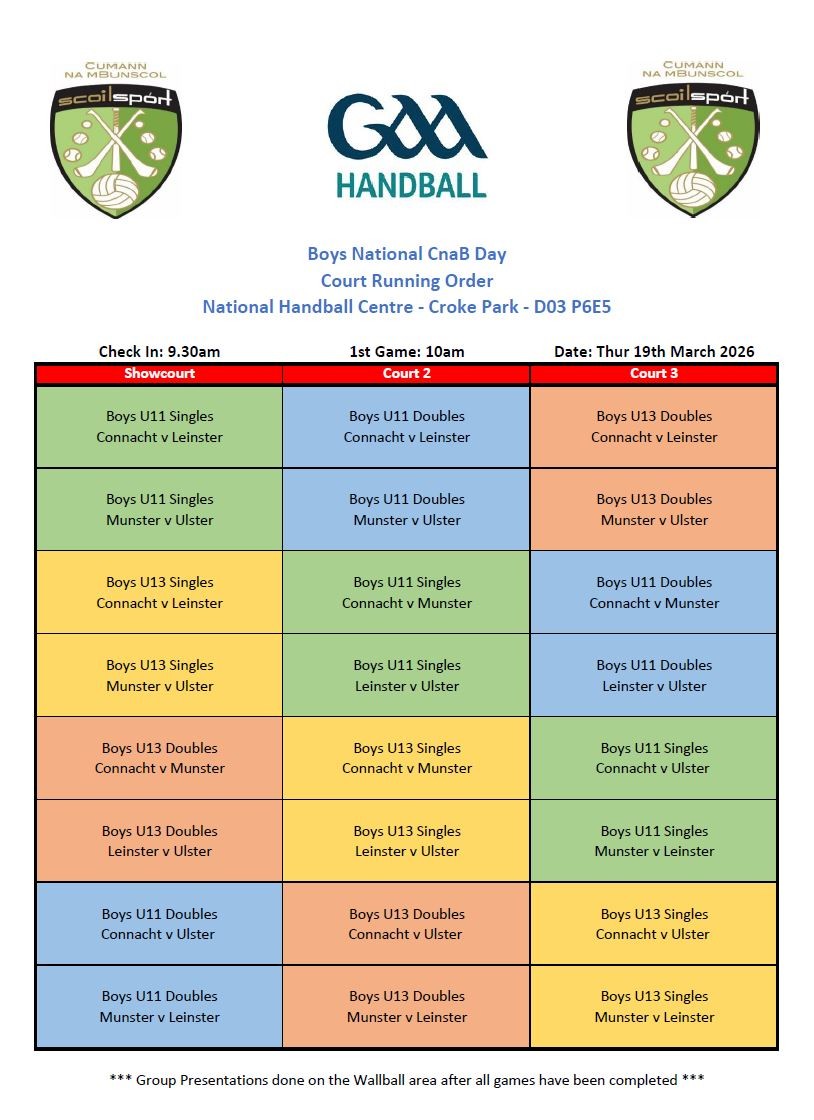 @cnambnaisiunta, @sciathnascol (Cork), @cnambanchlair (Clare), @cnmbwicklow (Wicklow), @CumannnamBunsco (Meath), @CnamB_Waterford (Waterford), @Doire_mBunscol (Derry), @AontroimCnamB (Antrim), @offalyschoolGAA (Offaly), @CnmbDublin (Dublin), @cnmbshligigh (Sligo), @CNMB50Cavan (Cavan)